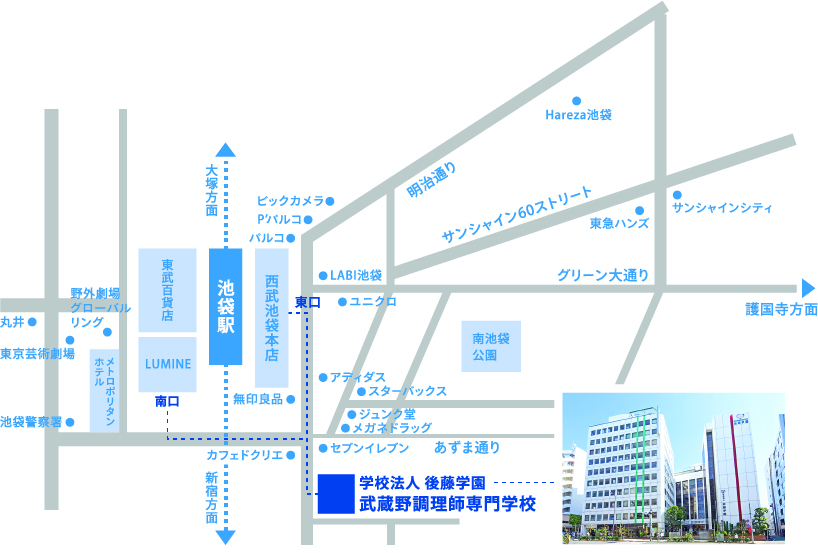 キャンパスがあるのは池袋。駅から徒歩5分の便利な場所にあります。