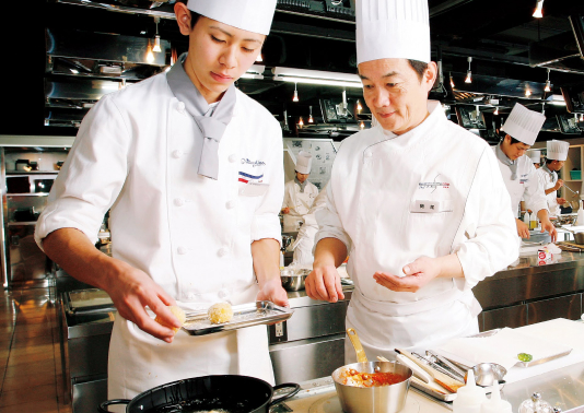 帝国ホテルで活躍する卒業生のなかには、料理長 として活躍するシェフもいます。本校が掲げる 「人格を育てる教育」や「実践授業」が一流ホテ ルで出世するにふさわしい人材の輩出を支えています。
